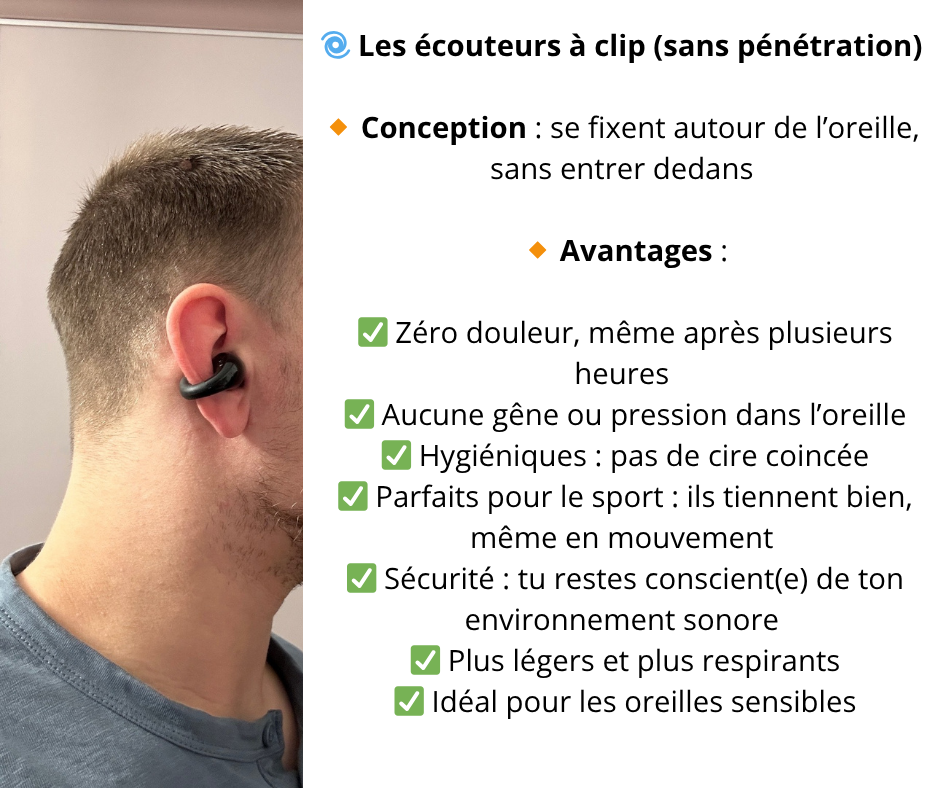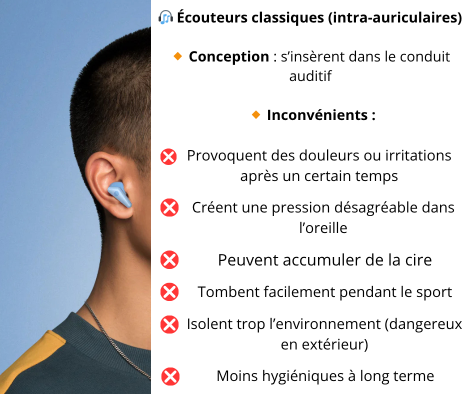 Non, contrairement aux écouteurs classiques, ils ne rentrent pas dans le conduit auditif, ce qui évite toute douleur ou gêne, même après plusieurs heures.